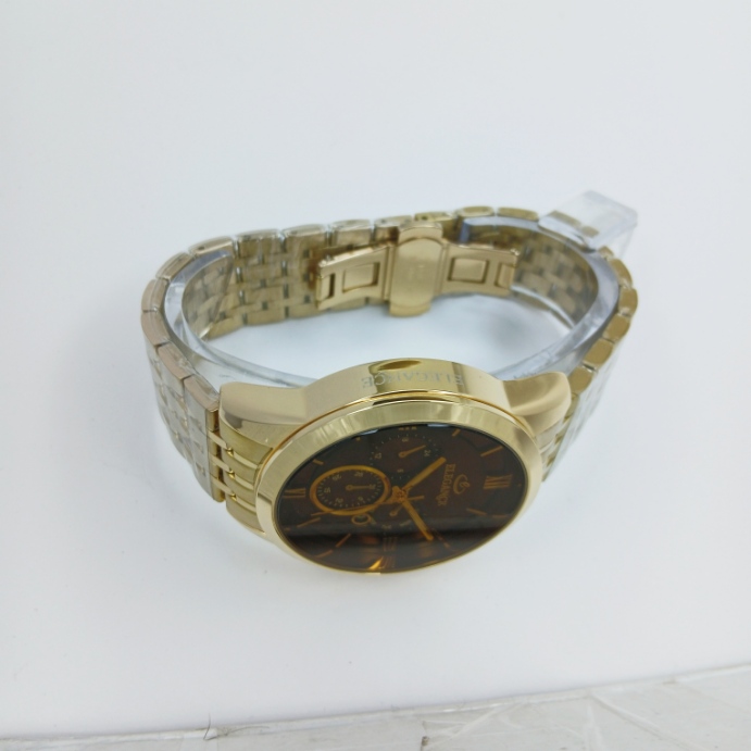 بدنه ساعت از استیل ضدزنگ ساخته شده و رنگ طلایی آن ثابت و بدون تغییر است. ضخامت قاب مناسب است و روی مچ حس سنگینی یا سبک بیش از حد ندارد. طراحی کلاسیک و ساده است اما در عین حال لوکس جلوه میکند.